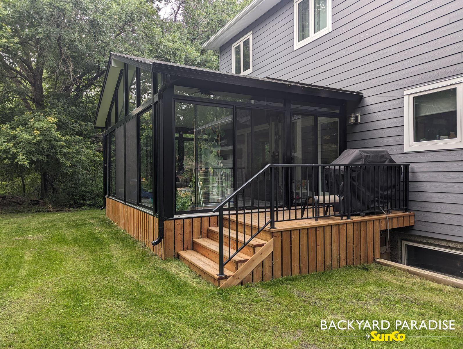 Black Gable sunroom with black aluminum railings , La Salle , Manitoba 2By Chris Reimer / December 3, 2025