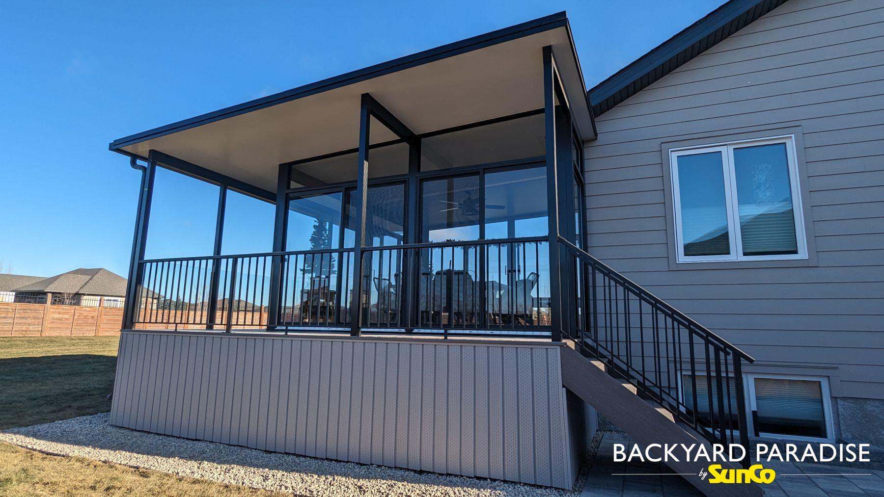Black studio sunroom with composite deck and black aluminum rail , Headingley , Manitoba 5By Chris Reimer / December 3, 2025