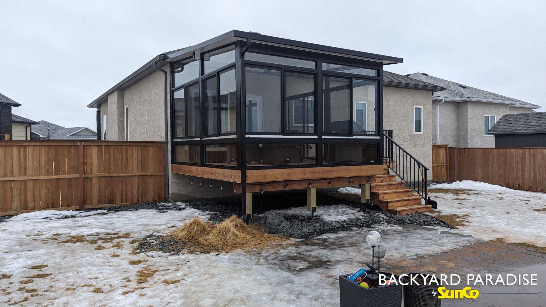 Black studio sunroom with treated wood deck and black aluminum railings, Stonewall, Manitoba 2By Chris Reimer / December 3, 2025