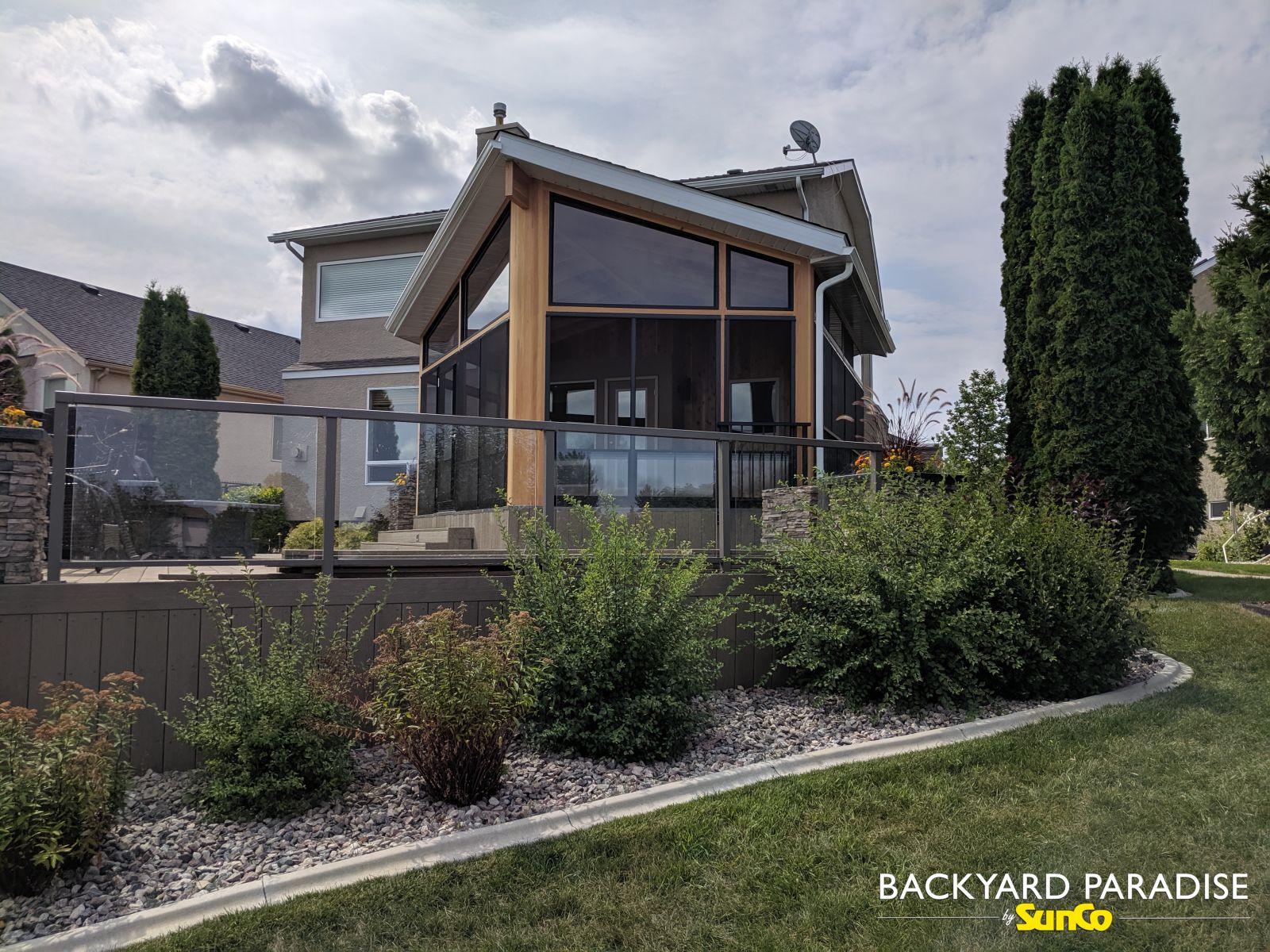 Douglas Fir and black windows Gable sunroom with angled front wall , Island Lakes, Winnipeg , Manitoba 1By Chris Reimer / December 3, 2025